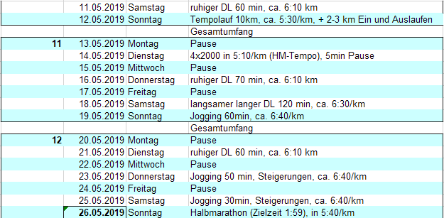 Ja ich hab ja letztes Jahr den Plan für 1:59h genommen und bin dann aufgrund der Wärme am Renntag nicht unter die 2h gekommen. Das wollte ich verhindern, da der Lauf ja sogar 2 Wochen später ist. Und einen Plan für 1:55 hab ich nicht gefunden. :censored