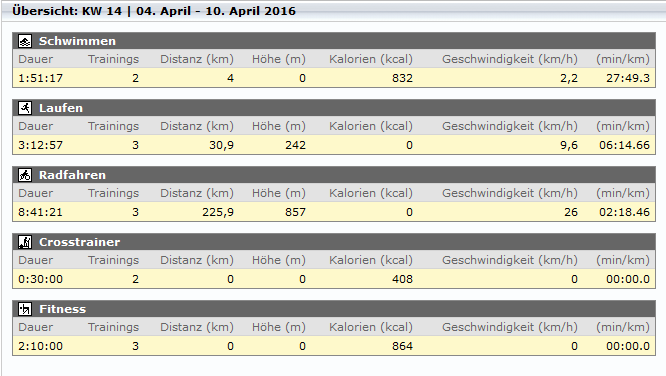 So komme ich diese Woche auf 16,5h Training: