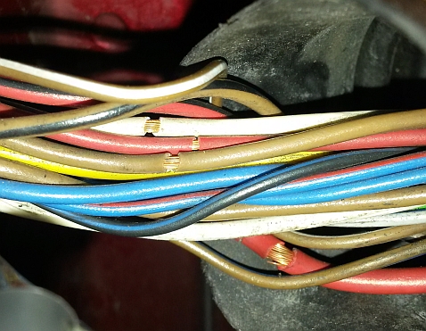 Erst mal die Betätigungsschalter aus der Verkleidung gehebelt - scheinen ok. Dafür deutet sich ein Masseproblem an. Nächste Station: Türdurchführung. Die zwei Enden des gebrochenen Kabels grinsen mir schon hämisch entgegen. Allerdings hat hier scheinbar der Vorbesitzer schon mal Hand anlegen lassen denn das Ganze sieht eben so aus wie wenn ein Blechpatscher sich in Elektrik versucht.