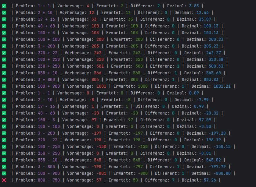 Nachdem meine KI das Addieren gut konnte, wollte ich ihr sagen, wie man subtrahiert, ohne es ihr an Beispielen zu zeigen. Leider hat das nicht funktioniert. :chris76