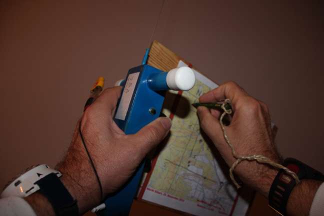Bei der ganzen Geschichte schleppt man doch allerhand Technik mit durch den Wald. Manchmal kommt man sich schon etwas Robocop-mäßig vor. Ich habe das nach dem Wettkampf mal im Bild festgehalten. Ich als Linkshänder habe in der linken Hand das wichtigste Utensil: den Peilempfänger. Die Finger halten aber gleichzeitig auch noch das Kartenbrett, auf dem mit zwei Weckgummis die Geländekarte fixiert ist. Der Mittelfinger darf zusätzlich auch noch als Träger für den Zeitnahmechip herhalten. Am Handgelenk sitzt dann noch ein Armbandkompaß, der eigentlich aus dem Tauchsport stammt. Weil im Dickicht das Kopfhörerkabel hängenbleiben und im schlimmsten Fall abreißen könnte wird es innen durch den Ärmel geführt, zusätzlich auch noch unter dem Kompaß-Armband durch. Die rechte Hand kümmert sich zum einen um die Bedienung des Funkempfängers, zum anderen darf sie aber auch den Bleistift für die Kartenarbeit halten. Damit der Bleistift aufgrund der Doppelbelastung unterwegs nicht flöten geht hängt er mit einer Fangleine am Armband der Stopuhr. Diese trage ich beim Funkpeilen ausnahmsweise rechts, weil ja am anderen Arm kein Platz mehr ist. Gleichtzeitig ist die Uhr aber wesentlich wichtiger als in anderen Sportarten, weil hier alles im Minutenrhythmus stattfindet.