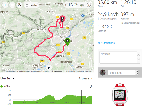 Aber heute ging es zuerst nach Einsingen und von dort zuerst ca. 3 Km über Eggingen hoch nach Ermingen und nach der Abfahrt dann sofort auf der anderen Seite für ca. 4 Km wieder hoch Richtung Lehr. Hier habe ich dann noch ein paar kurze Rampen eingebaut und hatte dann nach 35,8 Km 400 HM auf dem Tacho.