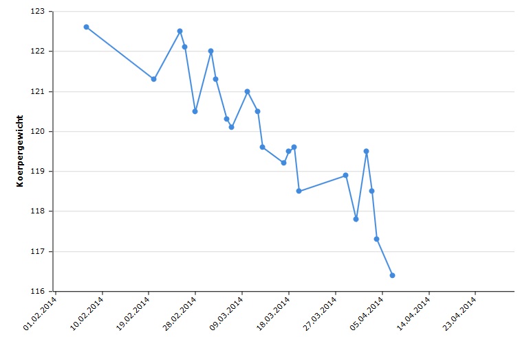 Laßt einfach einen gleitenden Mittelwert der vergangenen (z.B.) 7 Tage mitlaufen. Und genau deshalb würde ich auch das tägliche Wiegen dem wöchentlichen vorziehen. Denn die Tagesschwankungen zickzacken beim wöchentlichen genauso.